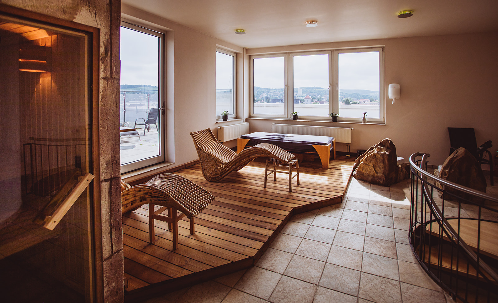 Entspannen Sie bei einem gemütlichen Gang in unsere Sauna und genießen Sie sonnige Tage auf unserer geräumigen Dachterrasse.